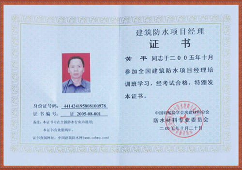 建筑防水項(xiàng)目經(jīng)理證書